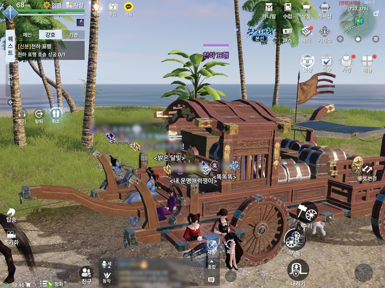 그리고 천하표행이라는 컨텐츠가 있는데 신분으로 약탈이나 약탈하는 사람을 체포하거나 하는 일도 가능하고 표행을 파티먹고 가져다 나르고 보상받는 컨텐츠다. 길드원들과 맘맞아서 같이하면 베스트지만 안되면 공팟구해서 껴가면된다.