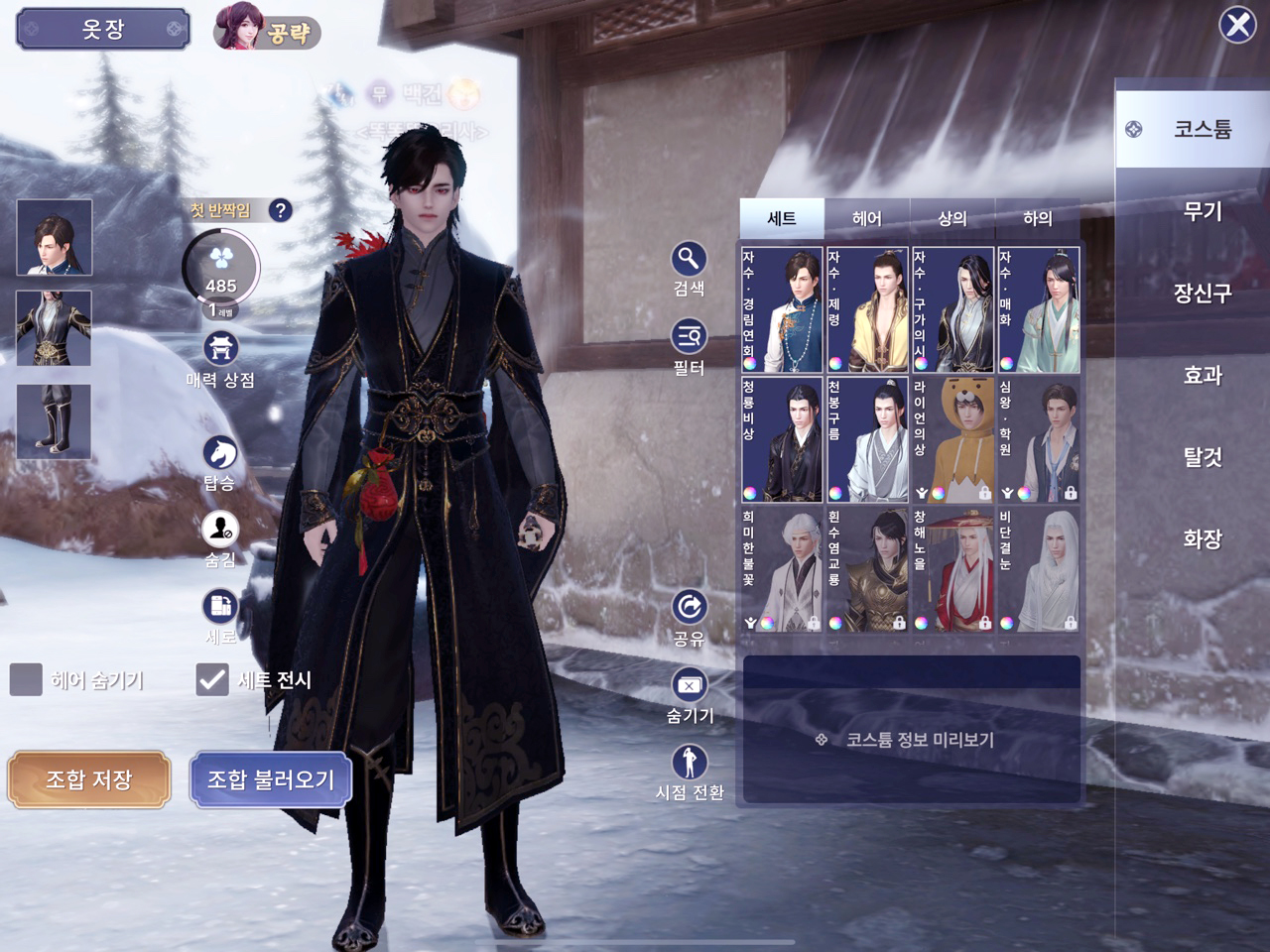 자신의 캐릭터 코스튬에 들어가면 세트로 모아진 템들은 저렇게 옆에 컬러가 선명해지고 누르면 세트로 슉슉 바꿔입혀준다. 나같은 경우는 헤어따로 상의 하의 따로 입혀줬다.