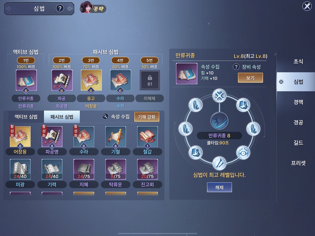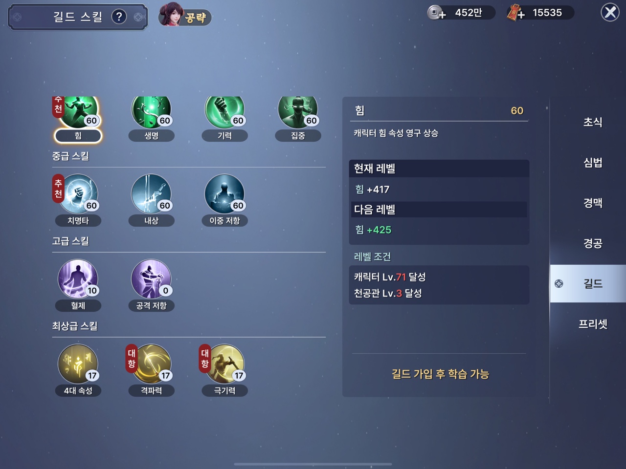 이제 길드공훈령이 남으면 최상급 스킬을 쫌쫌따리 찍으면 되는데 오르는건 코딱지만큼인데