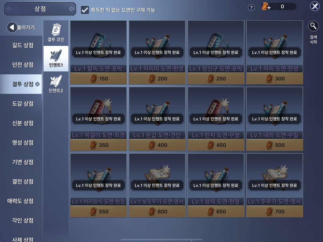 하여튼 인챈트다. 일단 상점에서 결투코인으로 lv.1구매가능하며 전부사서 장착하면 소량씩 공력이 오른다.