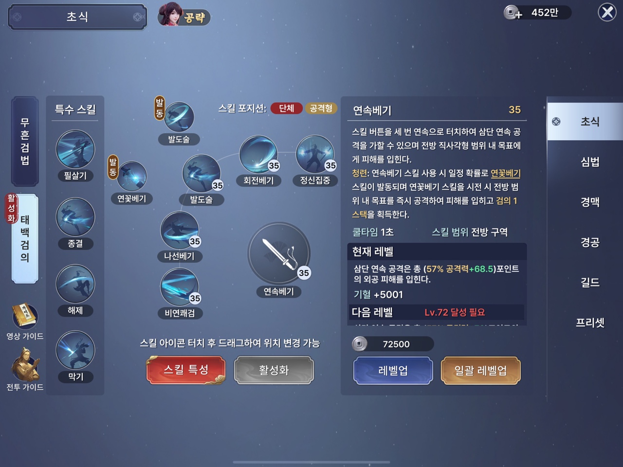 무흔검법은 pvp에 사용해야 유리하고 태백검의는 떼쟁이나 던전플에 딜이 잘나온다.