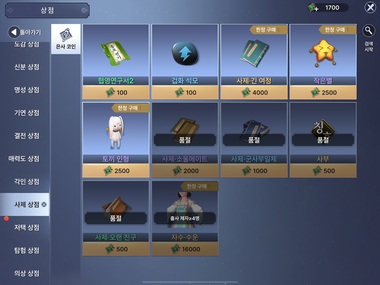 이게 재료가 백철이나 금실이다. 컨텐츠 하면서 얻는경우도 있고 상점에서 구매도 가능하다.