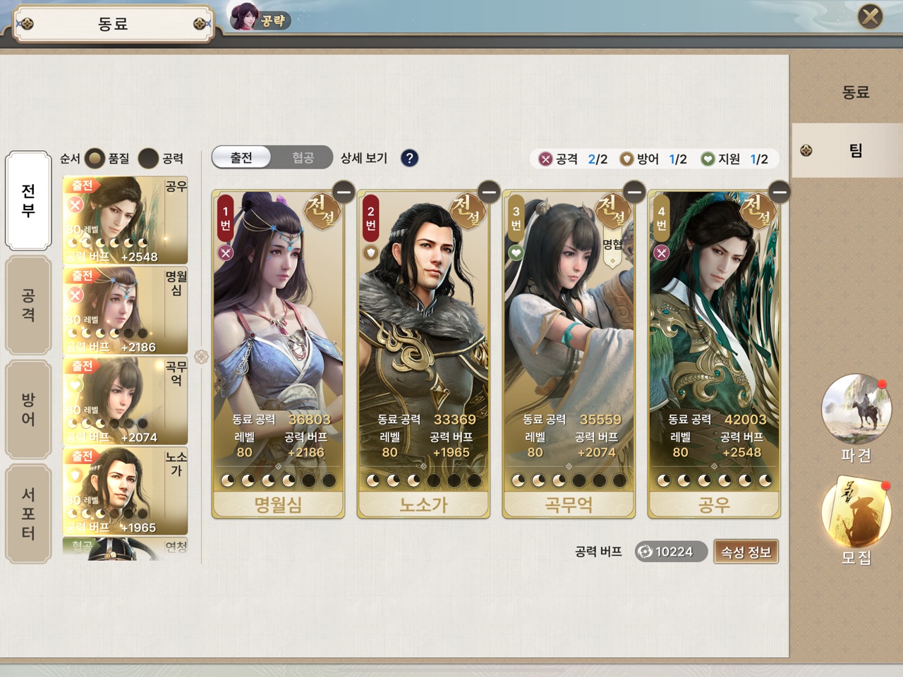 금색 동료를 출전시키는게 좋다. 그치만 없다면? 공력 버프가 높은 녀석들로 출전시키면 된다.